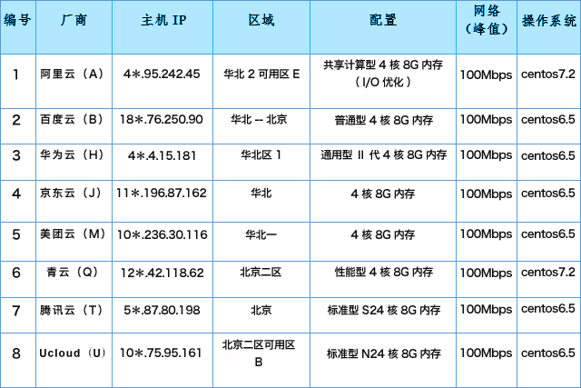 伴随着国家大众创业、万众创新的新时代,创新型企业大量广泛应用云服务快速提高生产力,短短几年的高速发展国内云计算市场已经初具规模,随着云计算在各个行业的快速渗透,传统企业也在不断尝试将原有业务迁移到云平台,如何提供稳定而高效的云主机平台是各云厂商的终极目标。 蓝海讯通公司使用OneCPT性能测试平台提供了一套简单而高效的方法,帮助最终用户了解国内各厂商标准化主机的实战性能指标,用公开透明的评测数据为用户提供更清晰明确的数据参考。 OneCPT————可分布式调用全球云主机及物理主机发起千万级并发压力的一站式性能测试平台,真正实现广域网间全链路真实高并发访问,监测数据实时计算秒级回传,无延时报告输出。 每个厂商都在北方区开启一台较常用的4 CPU 核心、8G网络带宽的云主机,详细配置请见下表: